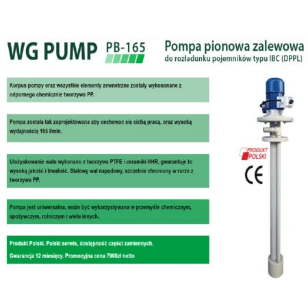 Pompa pionowa zalewowa to pompa do rozładunku cieczy ze znormalizowanych pojemników typu IBC (DPPL) oraz ze zbiorników, których głębokość nie przekracza 1,1m.