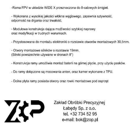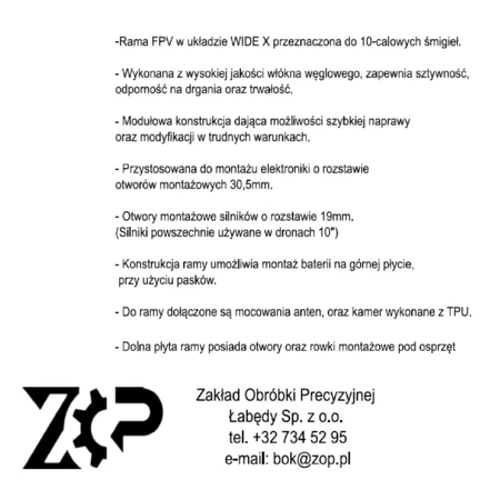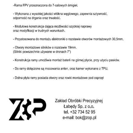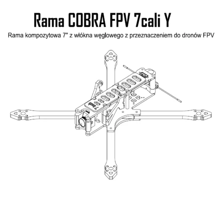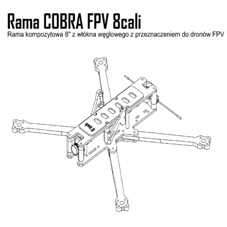 Ramy COBRA FPV to zaawansowana konstrukcja mająca zastosowanie wyłącznie we własnych wyrobach chroniona tajemnicą Producenta, zaprojektowane z przeznaczeniem na wyroby wojskowe jako drony kamikadze charakteryzujące się dużą sztywnością struktury nośnej, niską masą oraz odporne na obciążenia dynamiczne. Każdy komponent powstaje z autorskich płyt z włókna węglowego, które produkujemy we własnym zakresie z użyciem włókien o wysokim module sprężystości. Proces opiera się na technologii wysokociśnieniowej kompresji i kontrolowanym układzie warstw, co gwarantuje jednolitą strukturę materiału, minimalne naprężenia wewnętrzne oraz odporność na mikropęknięcia i delaminację. Precyzyjna obróbka CNC pozwala uzyskać perfekcyjne dopasowanie elementów, a kierunkowy układ włókien zoptymalizowany jest pod kątem pracy ramy w osiowej deformacji i absorpcji drgań. COBRA FPV to system nośny zaprojektowany do pracy w warunkach skrajnych, zapewniający stabilność mechaniczną i niezawodność przy najwyższych wymaganiach lotu.